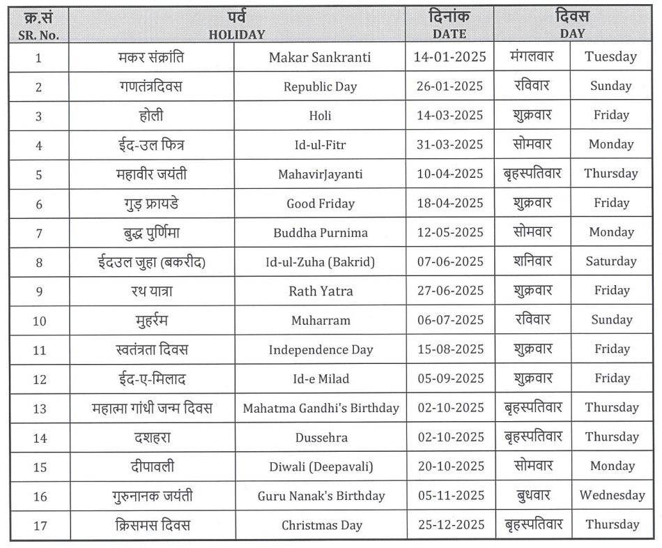 Holidays Calendar - 2025