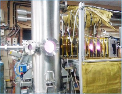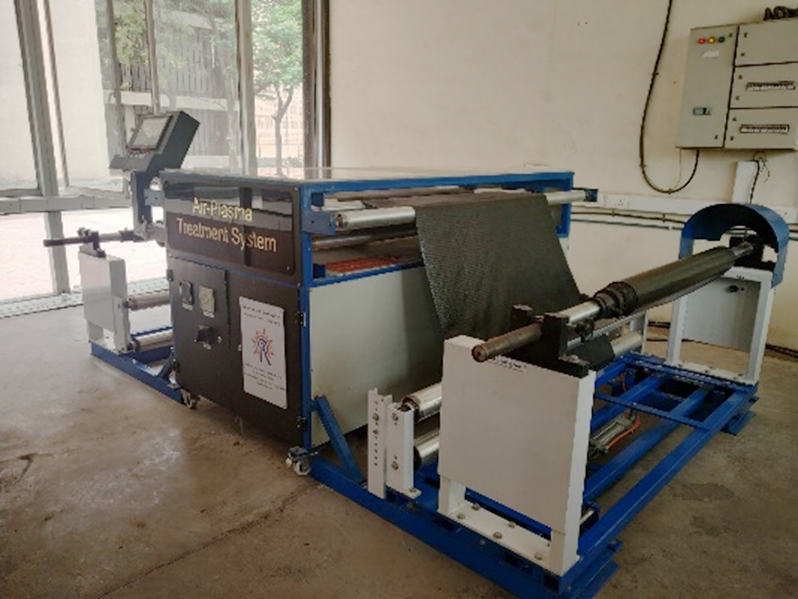 Development and supply of inline atmospheric pressure air plasma system for surface modification of HDPE film in Geo-membrane application: An atmospheric pressure air plasma system for the inline surface modification of HDPE (High Density Polyethylene) film has been developed by APD (Atmospheric Pressure Plasma Division), IPR and commissioned at CIPET (Central Institute for Plastic and Engineering), Ahmedabad in March 2020. This system comprises of 6 pairs of electrodes and generates a uniform glow discharge plasma in air over a width of 1.5 meter. The objective of this project is to develop a Geo-membrane with improved characteristics of strength and leaching. The plasma surface modification of HDPE film induces nano-scale surface roughness and increases its surface energy, which in turn can improve adhesion among different layers of HDPE used in Geomembrane. Detailed experiments for developing Geo-membrane from plasma modified HDPE films will be conducted by CIPET.