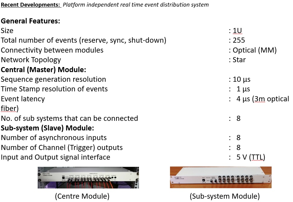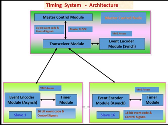 Design and development of VME based time synchronization and event distribution hardware and software for plasma pulse execution. The measured event transmission latency between two farthest nodes of distance 150 meters is 4 microseconds. The timing pulse resolution is 1 microseconds for all the channels.