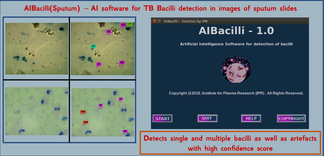 This is another AI software developed at IPR for automated detection of single/multiple mycobacillus in sputum smear test. This AI based Software uses AI based technique of Object Detection. Software development together with the relevent Hardware automation is being carried out to simplify the current practice. The work is being carried out in collaboration with Civil Hospital, Ahmedabad.